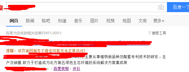 如图所示,搜索关键词显示一句 提醒:该页面因服务不稳定可能无法正常访问! 网站正常能打开,请问是什么原因造成的这种情况,如何快速解决?