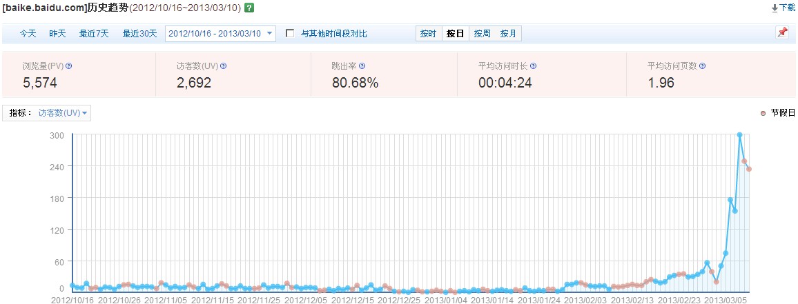 [导读]:上个星期5个工作日(2013.03.04-2013.03.08)做了1次外链试验。 在热门和相关的百度百科词目参考资料中添加网站文章的链接。 总共添加了64条百度百科外链,UV(独立访客)从03月03日的...