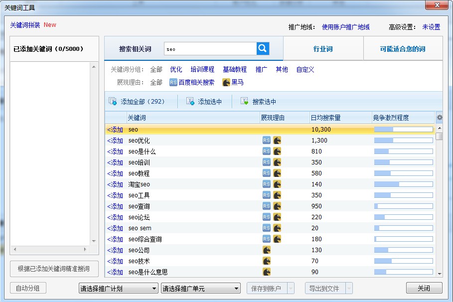 使用过百度竞价的朋友都知道,在百度竞价中有这么一个工具,就是百度关键词推荐工具,当输入一个关键词在搜索框中时,就会出现与该关键词相似的并且具有检索量的关键词,并且还会出现检索次数,这个功能是非常有利于我们对网站的长尾关键词进行分析和收集的。