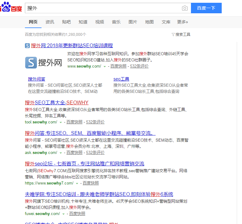 收录只是第一步,其实每一个收录都是有排名的,只是排名的先后而已,比如我们搜“搜外”这个词,结果约1,280,000个