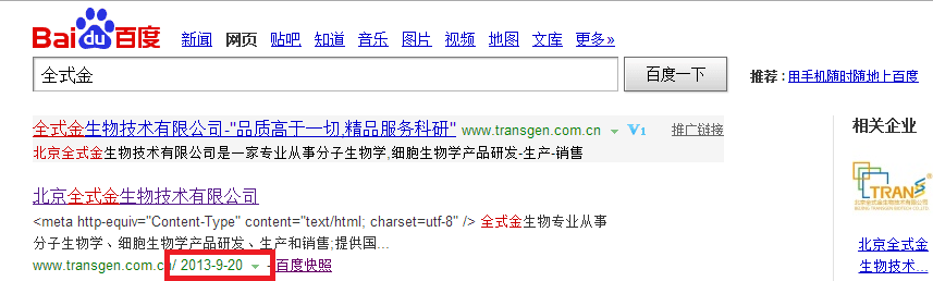 来了之后网络主管就要我解决这样一个问题,在百度搜索“全式金”出现在第一位的是2013年9月20号的快照索引。