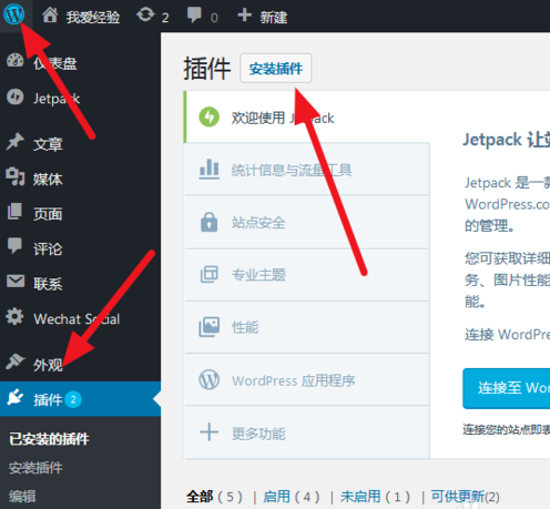 1.打开WordPress控制后台,点击右上角的wordpress图标,然后点击“插件”“安装插件”