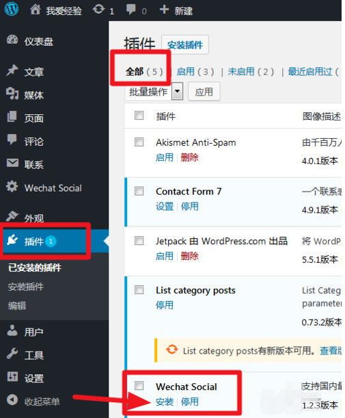 点击“全部插件”,在wechat social插件处,点击“安装”