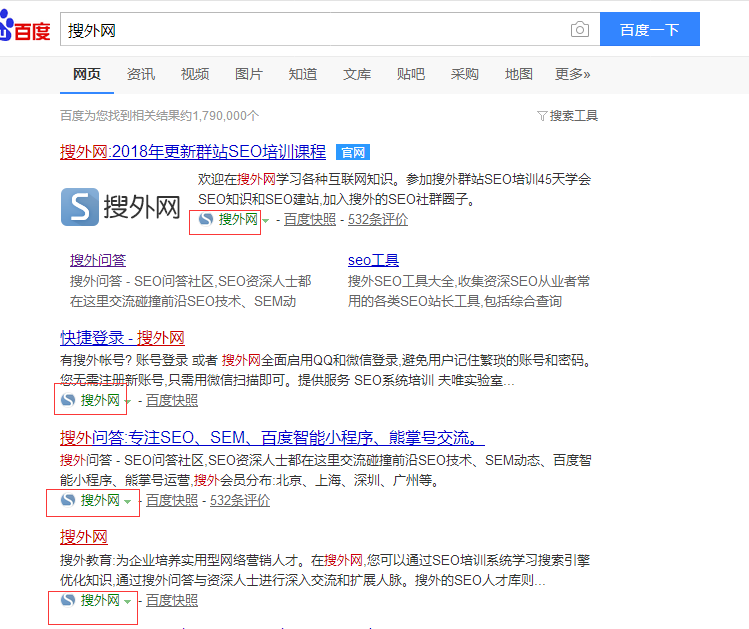 在百度的一些搜索结果页,本该显示URL地址的地方不显示URL,而是显示一个小logo和一个网站名称 比如说搜索搜外网的结果: