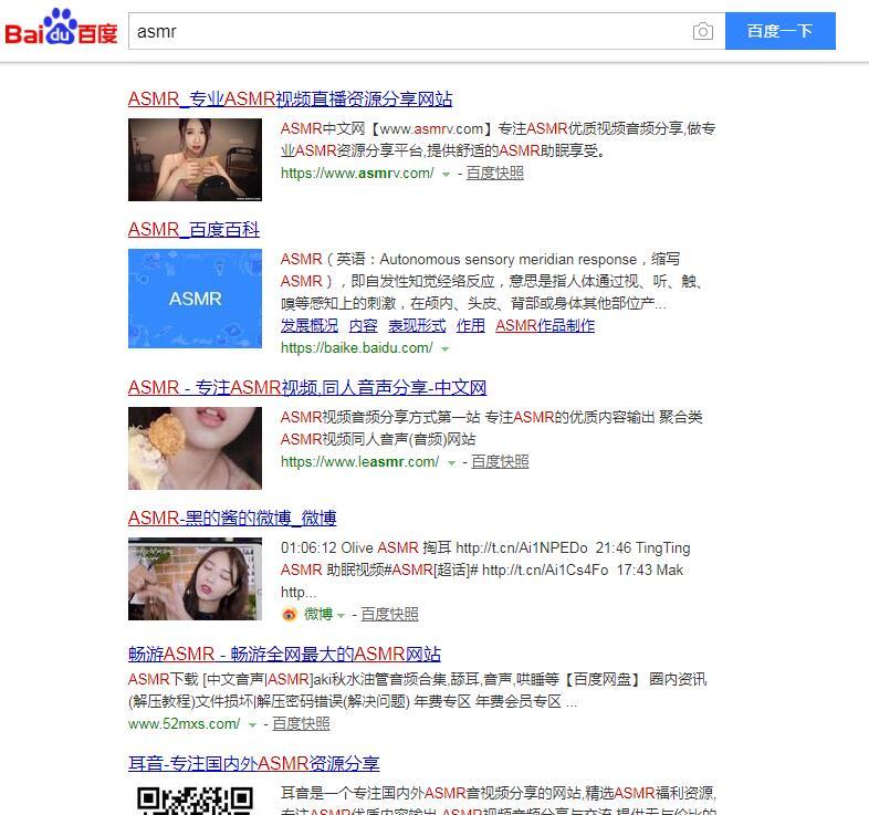 列如图中的这个词,百度第一页的是几个做了很久的主打asmr的老网站,第二页开始基本上都是各种贴吧,b站,各种视频网站的内页.