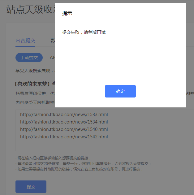 [导读]:熊掌号又出问题了吗?都提交不了了! 今天不行 ### 明天吧,今天都有问题 ### 可以使用API提交 ### 今天就是不合适,提交失败 ### 没事,下次再提交就好了...