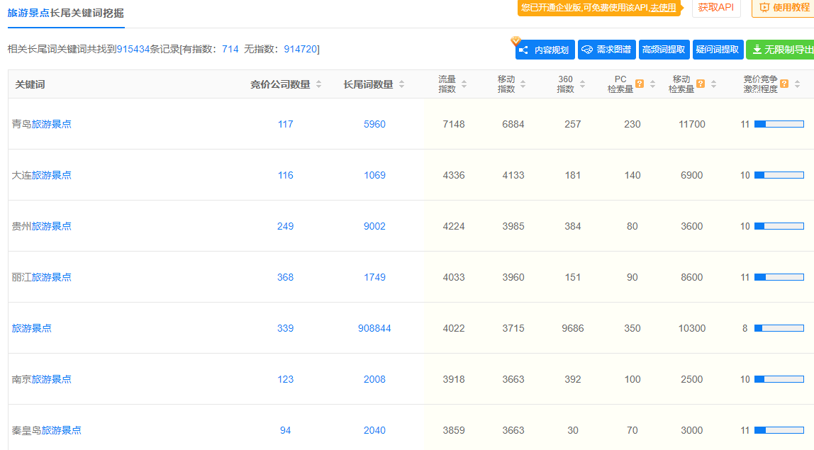 如下图:通过关键词挖掘,了解用户需求,通过数据分析,了解这个词的竞争度,冷热度,是否适合做排名,要是太热门的词,就不要硬做了,徒劳无功。