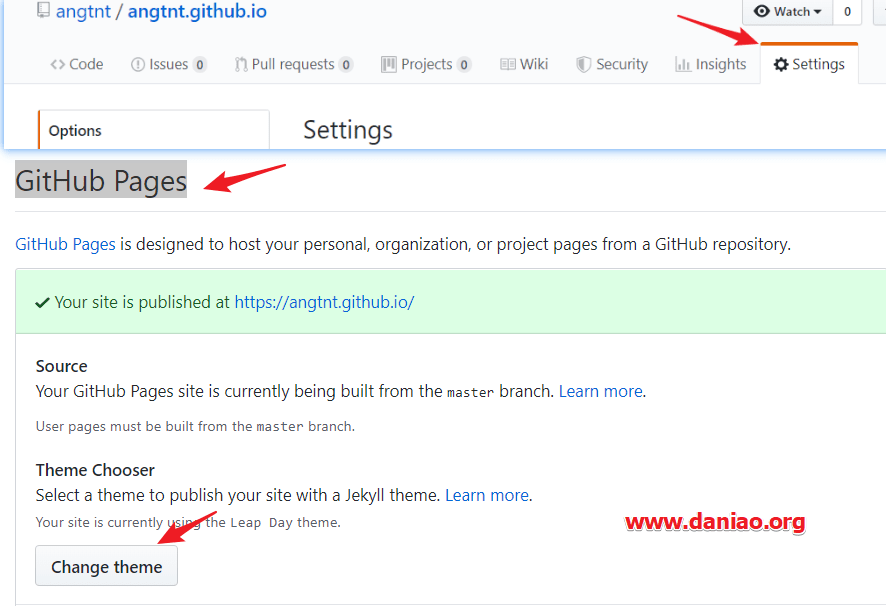 Source这里选择master branch;Theme Chooser随便选择一个提交就可以了,之后会给你username.github.io这样的网址就表示实在对了,因为我们用public推送必须要这样的网址形式,不然会不显示CSS样式。