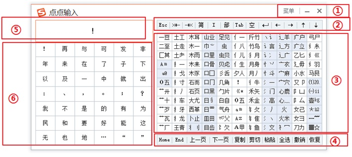 打字方面,鼠标在3索引区点选部首或者拼音,鼠标自动跳转到6候选区,选择相应的文字后即可上屏。