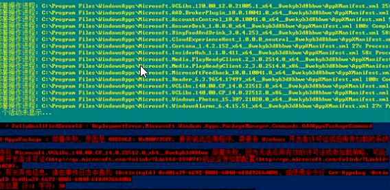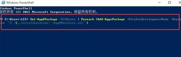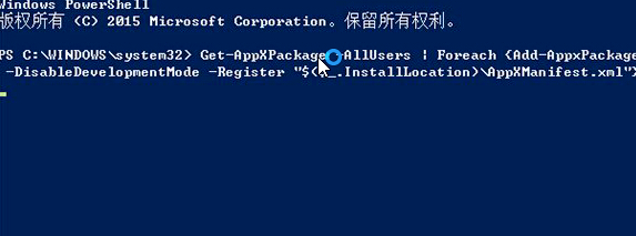 “Get-AppXPackage -AllUsers | Foreach {Add-AppxPackage -DisableDevelopmentMode -Register “$($_.InstallLocation)\AppXManifest.xml”}”