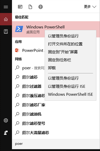 3.在Cortana中搜索“”Windows powershell”,用右键”管理员模式“启动。