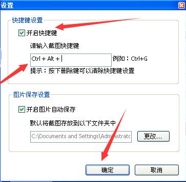 3、在打开的设置页面中,选择“开启快捷键”,然后设置快捷键(也可以不更改),然后点击确定即可,这样就可以利用该快捷键进行截图了: