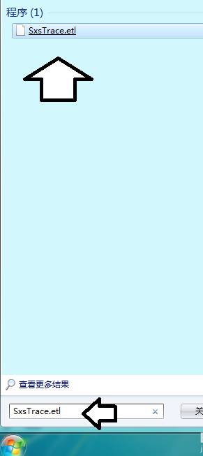 7、在开始菜单搜索框中输入:SxsTrace.etl文件名就能找到该文件,查看出错的原因等讯息。