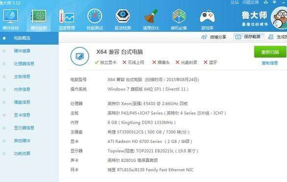 鲁大师拥有简单的硬件检测,不仅超级准确,可以向你提供中文厂商信息,让你的电脑配置一目了然,拒绝奸商蒙蔽。它适合于各种品牌台式机、笔记本电脑、DIY兼容机,实时的关键性部件的监控预警,全面的电脑硬件信息,有效预防硬件故障,让您的电脑免受困扰。鲁大师帮你快速升级补丁,安全修复漏洞,远离黑屏困扰。更有硬件温度监测等带给你更稳定的电脑应用体验。如果你要购买电脑、升级系统,那么请不要拒绝鲁大师的帮助。鲁大师拥有专业而易用的硬件检测、系统漏洞扫描和修复、各类硬件温度监测装机的繁琐和疑难,鲁大师帮助您轻松搞定。