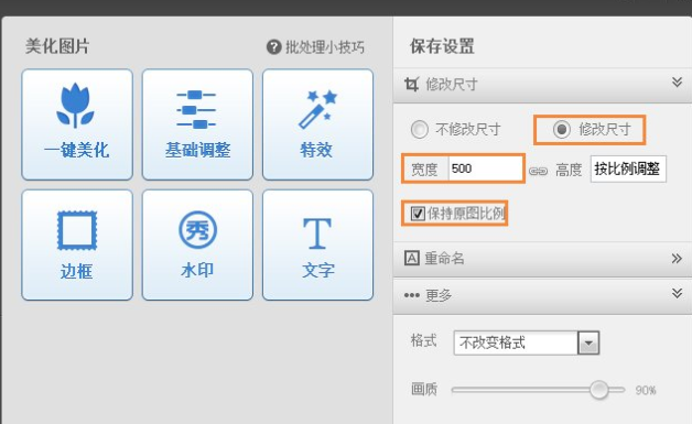 4、在右侧的【保存设置】点击【修改尺寸】,输入500*500