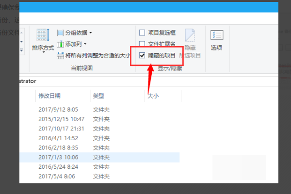 5、看到“隐藏的项目”之后,在前面打上勾勾,就显示备份到电脑的文了。