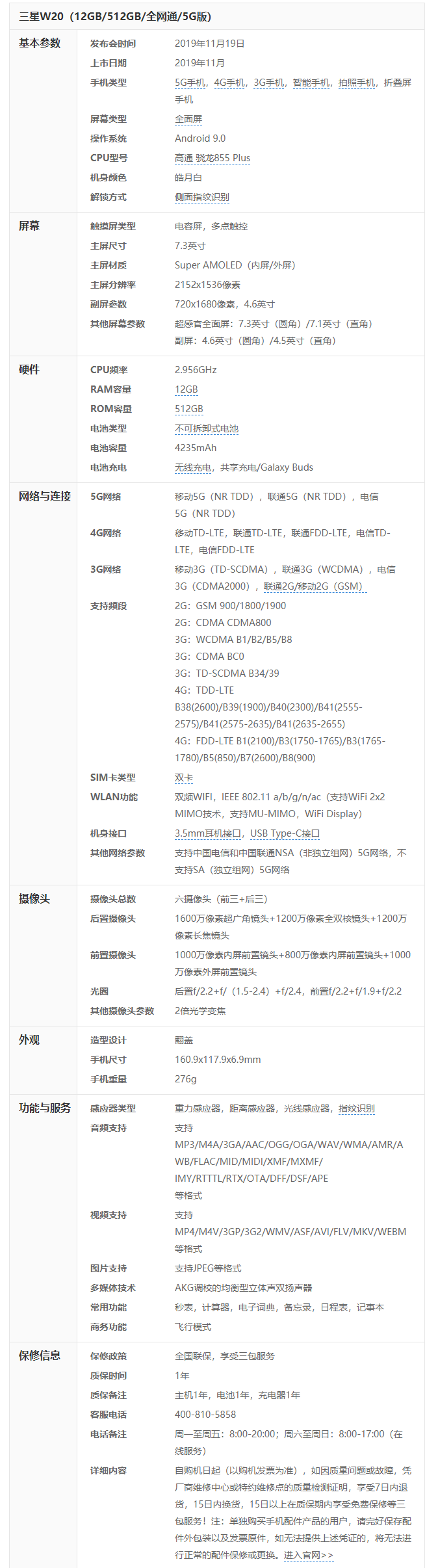 二、三星w2020详细参数:(点击下方图片查看大图)