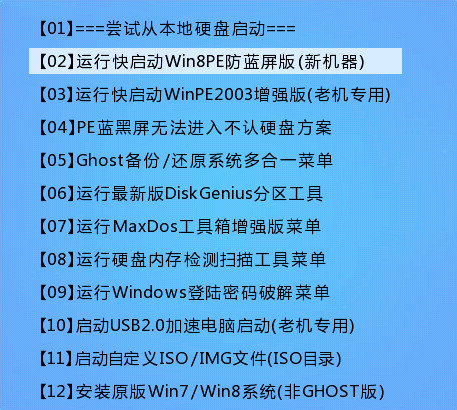 1、将准备的u盘启动盘插到电脑usb接口上,然后开机,看到logo图标后按电脑启动快捷键进入快启动主菜单页面,接着用键盘上的上下键将光标移至“【02】运行快启动Win8PE防蓝屏版(新机器)”并回车确定,如下图所示