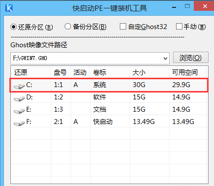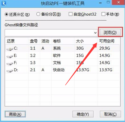 2、进入桌面后,系统会自启快启动一键装机工具,在工具界面点击“浏览”按钮,如下图所示