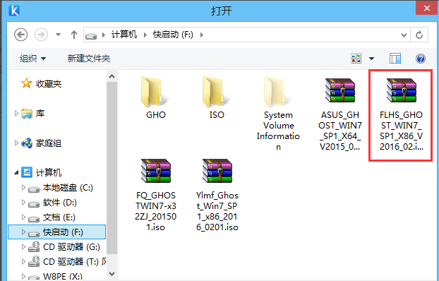 3、在打开窗口左侧列表中点击u盘,然后选择保存在里面的风林火山ghost win7 sp1 x86系统iso镜像包,继续点击“打开”按钮,如下图所示