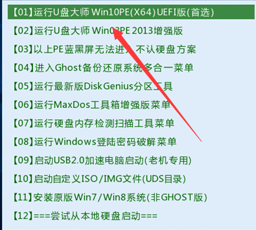 2、进入到U盘装机大师主菜单界面后,选中“【01】运行U盘大师Win10PE(X64)UEFI版(首选)”