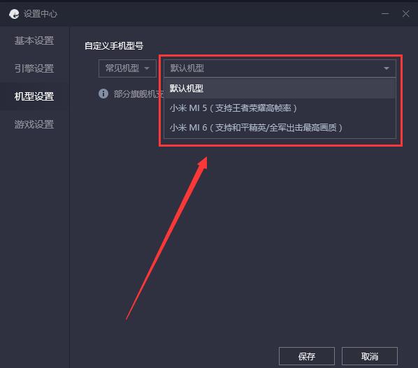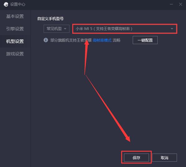 4、根据说明,想要玩王者荣耀的话。选择【小米 MI5】,然后点击保存并重启模拟器就行了。