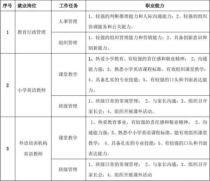(4)掌握儿童教育基本理论与方法,具备从事小学、幼儿园英语教育教学工作或相关职业岗位实际工作的能力;