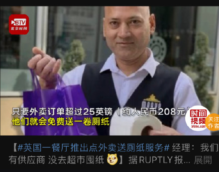 一直就很迷,国外就是和厕纸较上劲了,没口罩可,没吃的也可,就是不能没厕纸【#英国一餐厅推出点外卖送厕纸服务# 经理:我们有供应商 没去超市囤纸】据RUPTLY报道,英国一家印度餐厅为了促进消费,推出点餐送厕纸服务。只要顾客订单超过25英镑,就可以拥有一卷免费的厕纸。然而,这一激励措施在社交媒体上引起了负面反应,不少人认为正是由于像他这样的餐馆大量囤纸,才导致超市厕纸售罄。对此,经理则回应称并未去超市清空货架:“我们有批发供应商!” @时间视频 L时间视频的微博视频