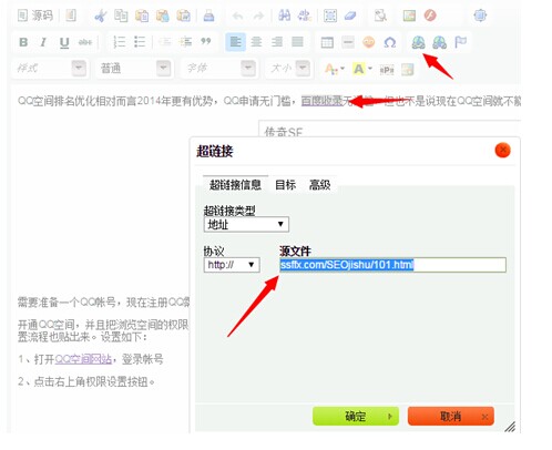 通常情况下,我们在编写一篇文章的时候,编辑都会提供一个锚文本链接的功能,在功能上面增加链接即可,不需要懂代码也可以做锚文本链接,如下图所示:
