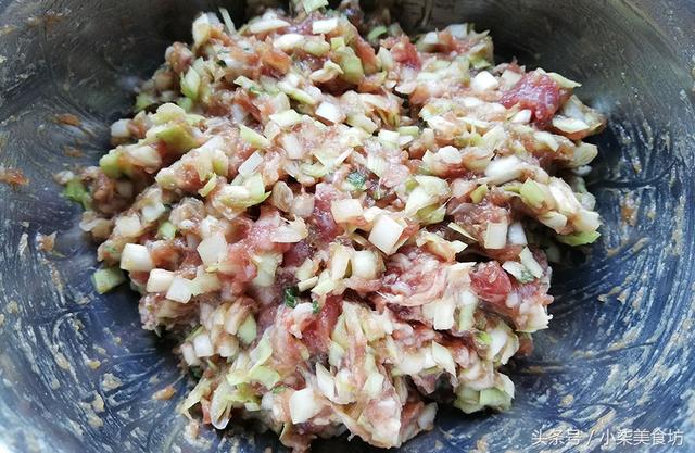 5、把牛肉馅放入小盆里,姜切成末,然后把所有调料加进牛肉馅里,顺着一个方向搅拌均匀,再把切好的蒜黄放进去。