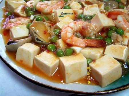 第六种:五彩豆腐虾仁球材料:鸡蛋豆腐3盒、虾仁6两、鱼浆6两、黄色绿色豌豆仁少许腌虾料:太白粉3大匙、盐少许、葱姜水2大匙调味料:太白粉1大匙、胡椒粉少许做法:虾仁洗净拭干剁碎,与鱼浆及腌虾料拌匀为馅。 豆腐切圆片沾太白粉,在两片中间夹入馅料呈筒状,全部做好后备用。用煎炸锅入油,以中火加至中温后入豆腐炸定型,移至盘中用中大火蒸8分钟即可。以开水将黄、绿色豌豆仁烫熟后捞起,另起锅加入胡椒粉及太白粉水煮滚淋至盘上。如图: