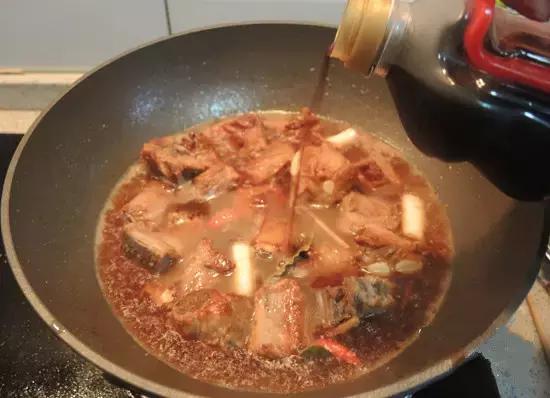 6. 加入开水,没过排骨即可(冷水易造成肉质紧缩不易入味),再加入生抽、老抽。烧开后转小火炖20~30分钟。