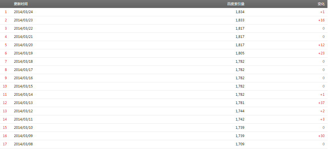 变化:根据网站的索引数据进行一天一次的变化,+1代表索引量增加一条,顾名思义-1代表索引数据减少一条。